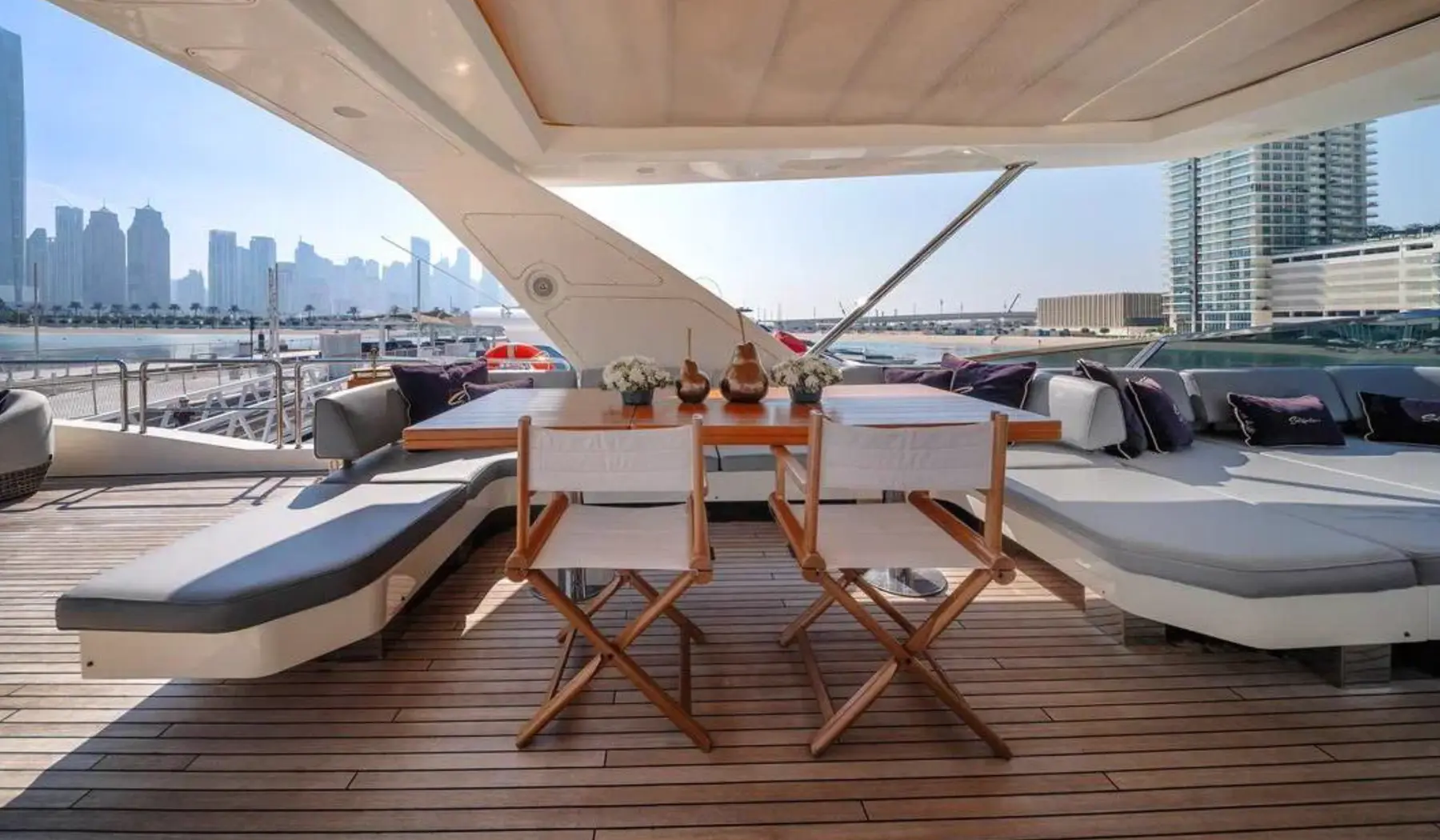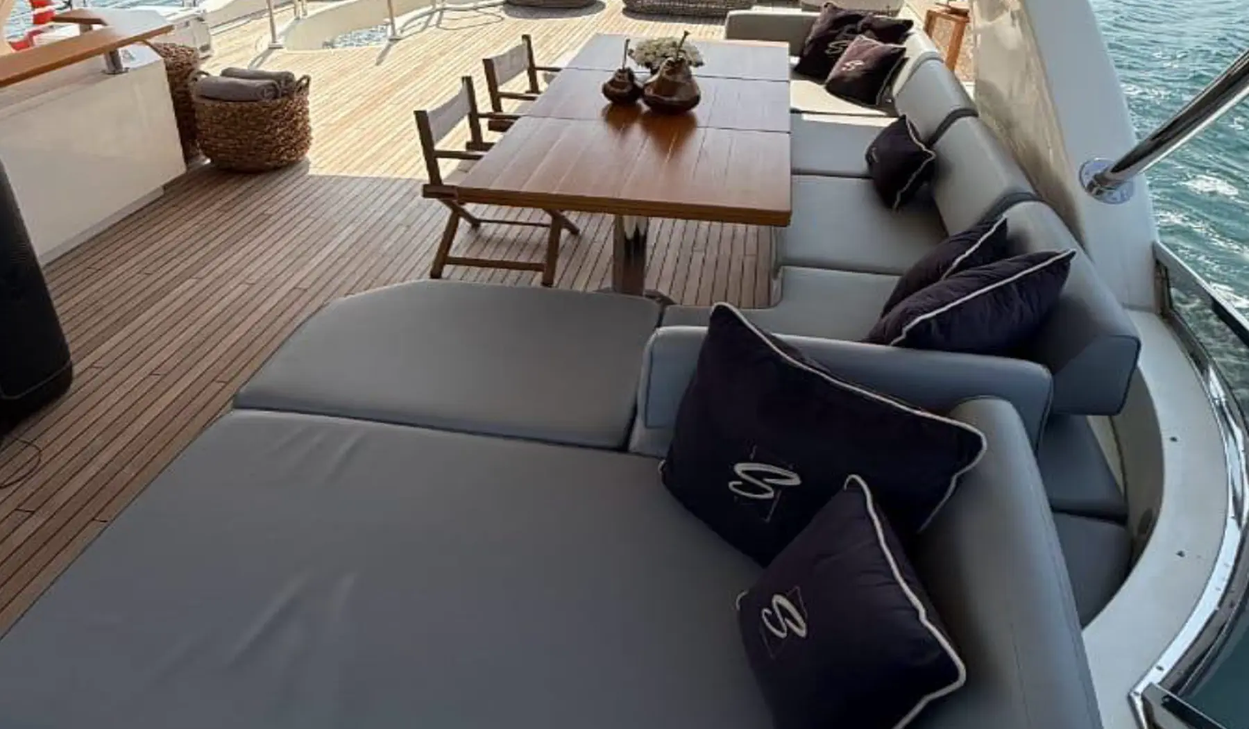Expansive flybridge with lounge seating, sunbeds, and a wet bar