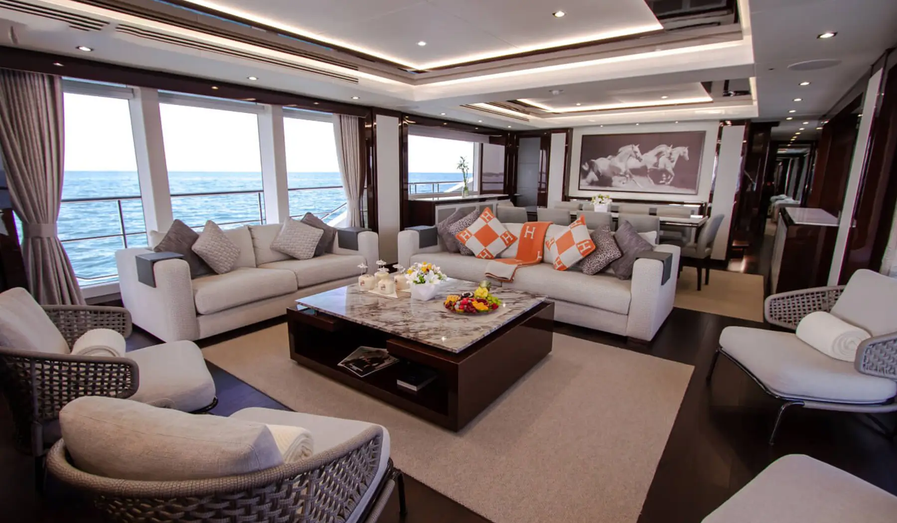 Stylish main salon with plush seating and state-of-the-art entertainment systems.