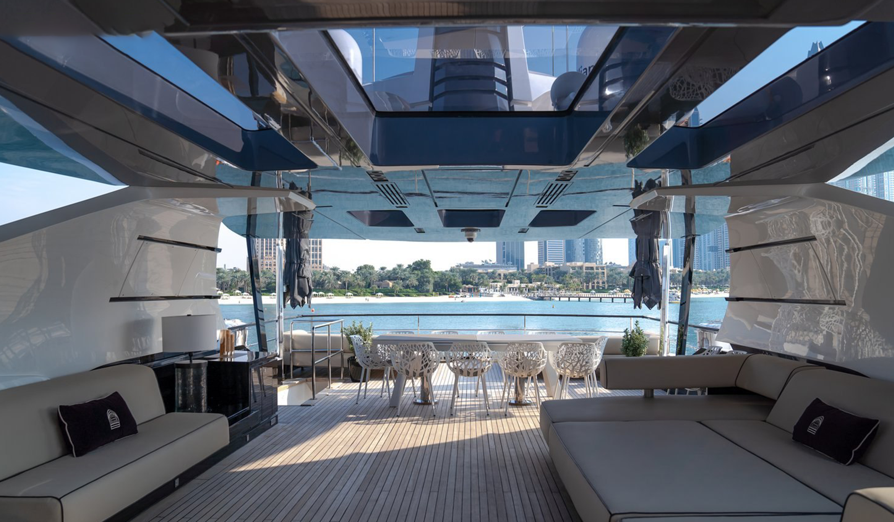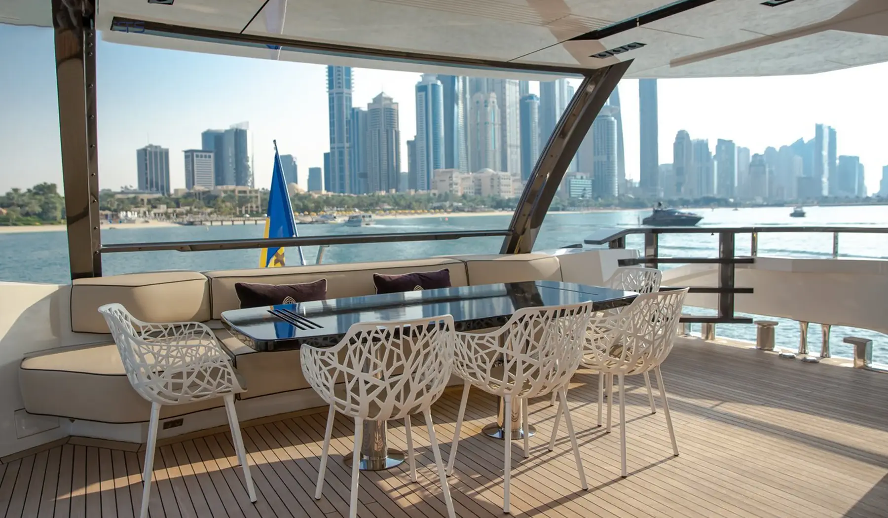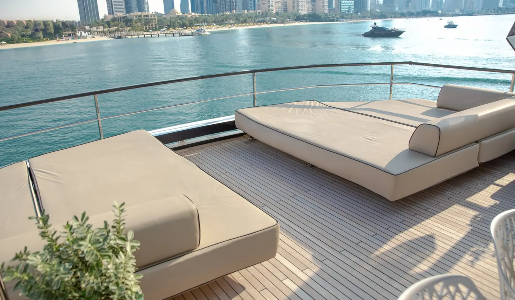 Powered by robust engines and managed by an expert crew, this yacht offers smooth sailing for up to 25 guests during the day and 10 overnight. From the Dubai Marina to the Palm Jumeirah, Suffuriya guarantees a journey of elegance and style on Dubai’s sparkling waters.