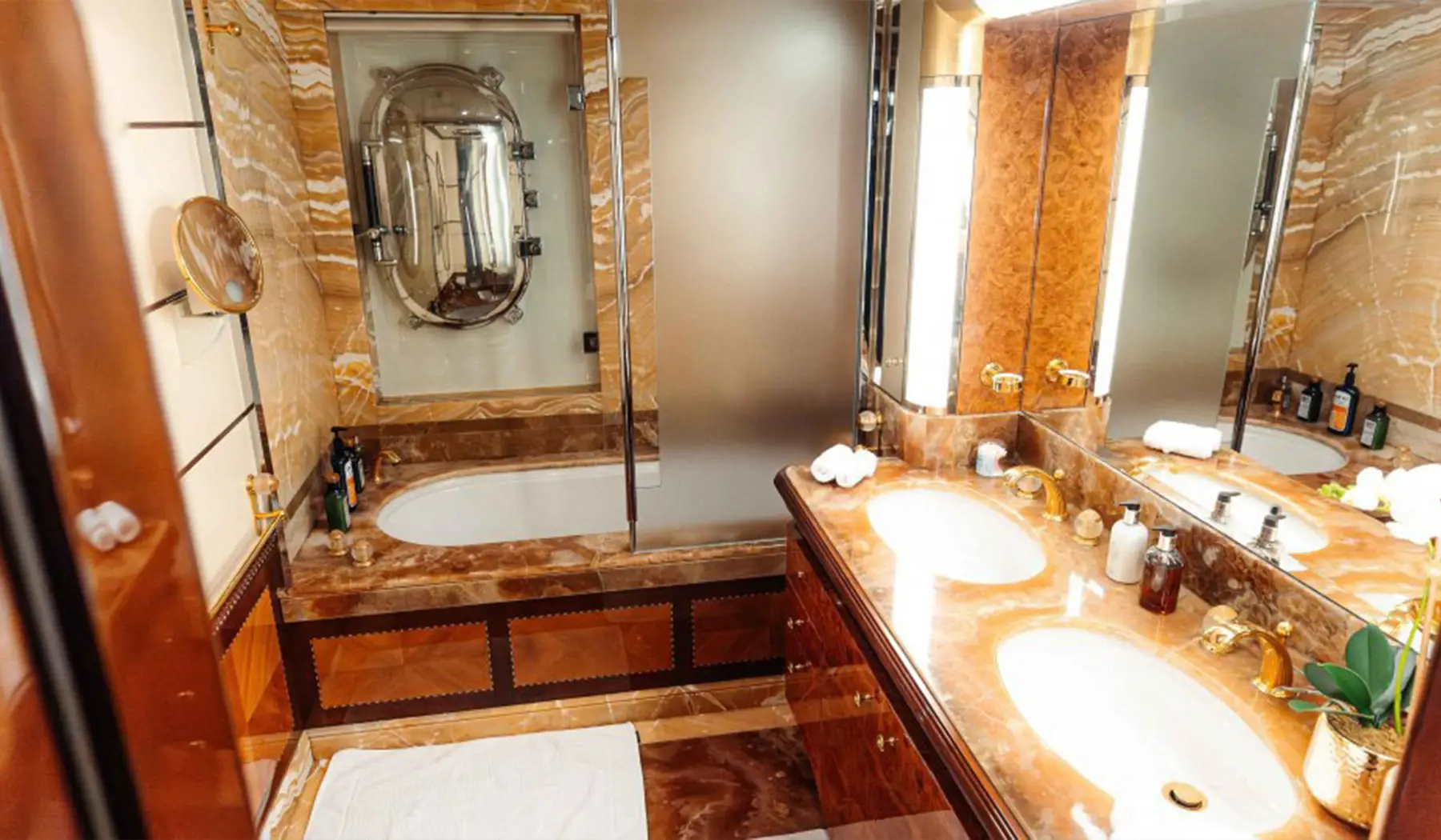 Luxurious cabins: 1 Master, 2 VIP, 2 Double, and 2 Twin, all with en-suite bathrooms.