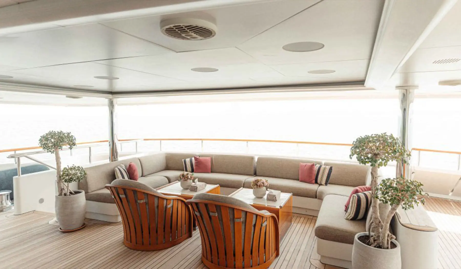 Expansive sundeck with Jacuzzi, bar, and lounging areas.