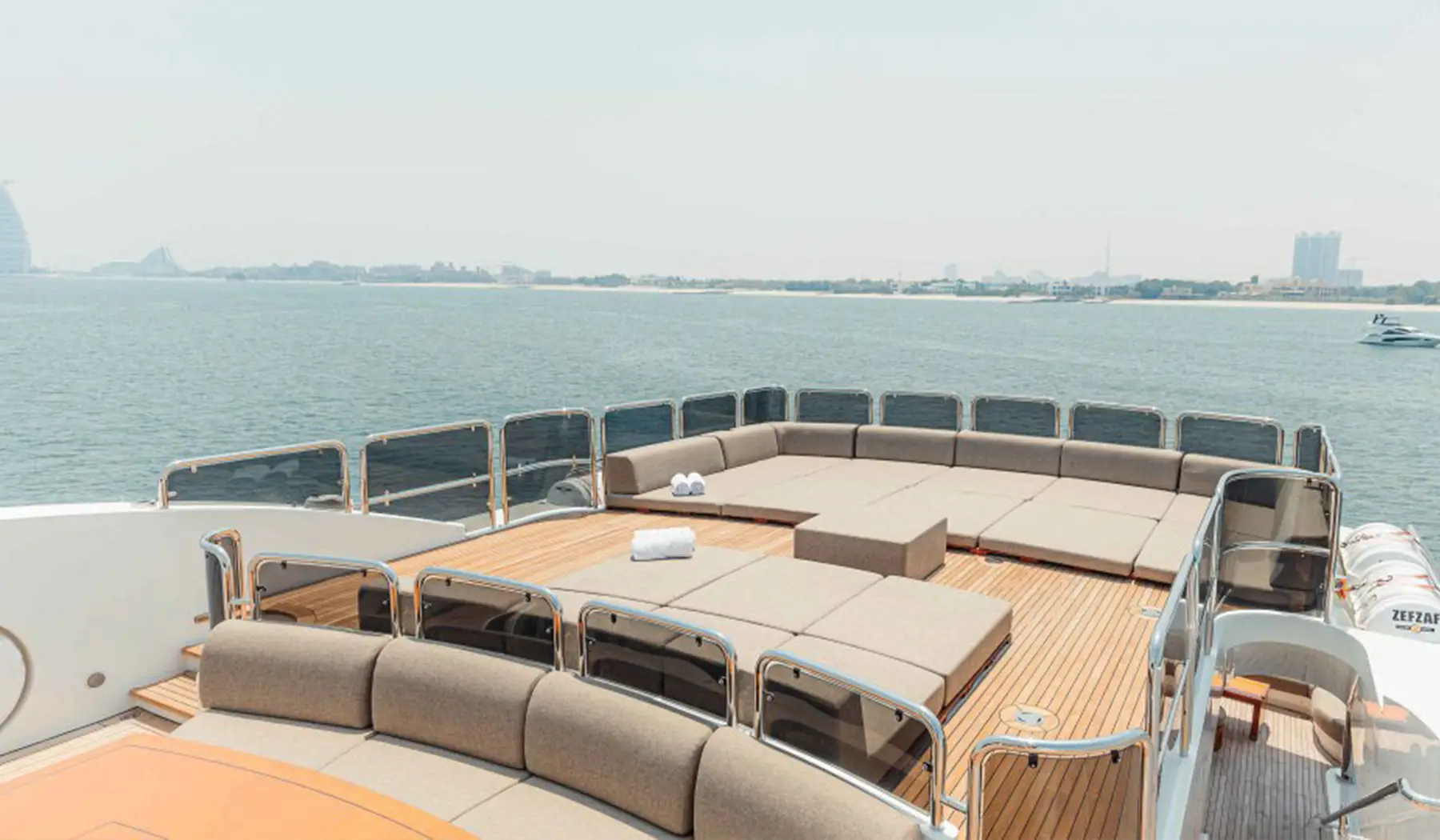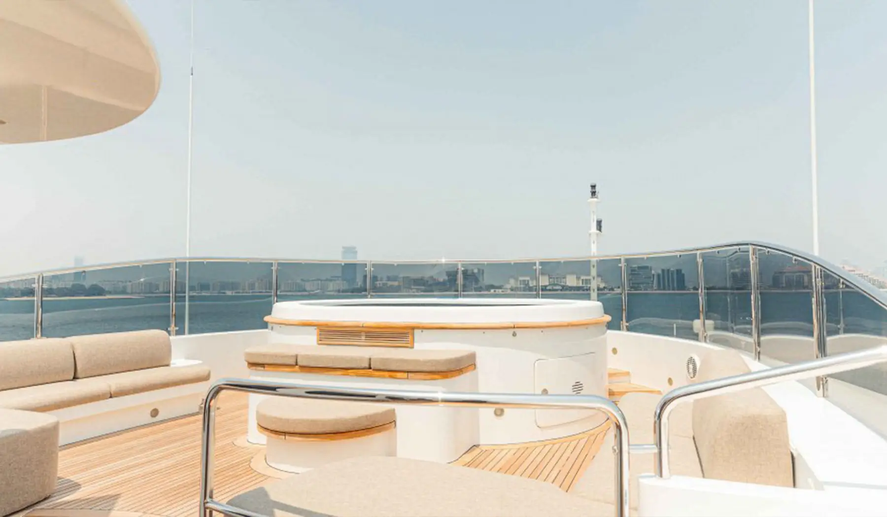 The yacht’s exterior exudes sophistication, with sleek, flowing lines and expansive outdoor areas spanning three luxurious decks. The sundeck features a Jacuzzi, a fully stocked bar, and ample lounging space, perfect for unwinding under the Arabian sun while soaking in panoramic views of Dubai’s skyline. Inside, the open-plan salon and dining area showcase meticulous craftsmanship, floor-to-ceiling windows, and elegant furnishings that blend seamlessly with breathtaking ocean views.